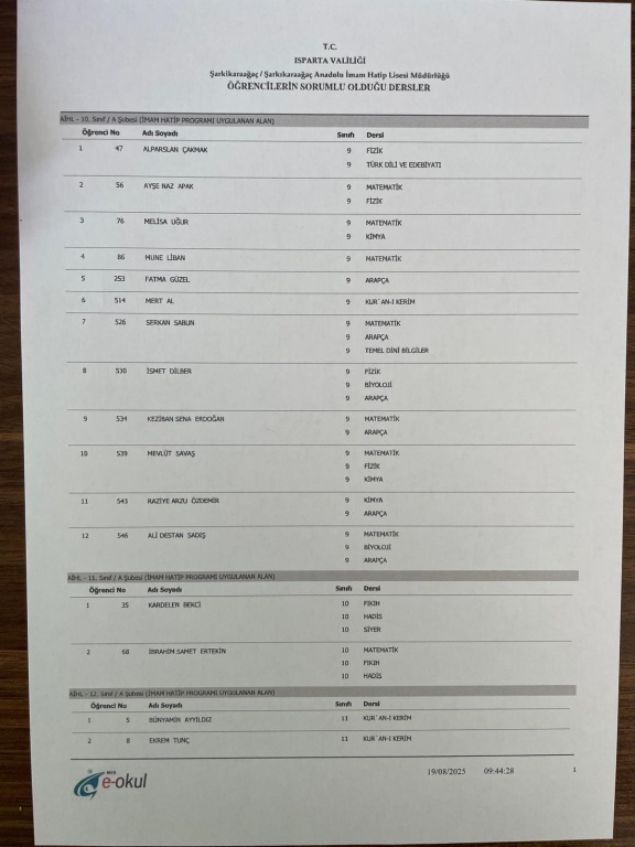 Okulumuz öğrencilerine önemli duyurudur. '2025-2026 öğretim yılı sene başı sorumluluk sınavları okullar açıldığında ilk hafta yapılacaktır.Geçen seneden sorumlu dersi olan öğrencilerimizin sınavlara hazırlanmaları gerekmektedir.Sorumlu dersi olan öğrencilerimizin listesi ve sınav programı aşağıdadır.Önemle duyurulur.